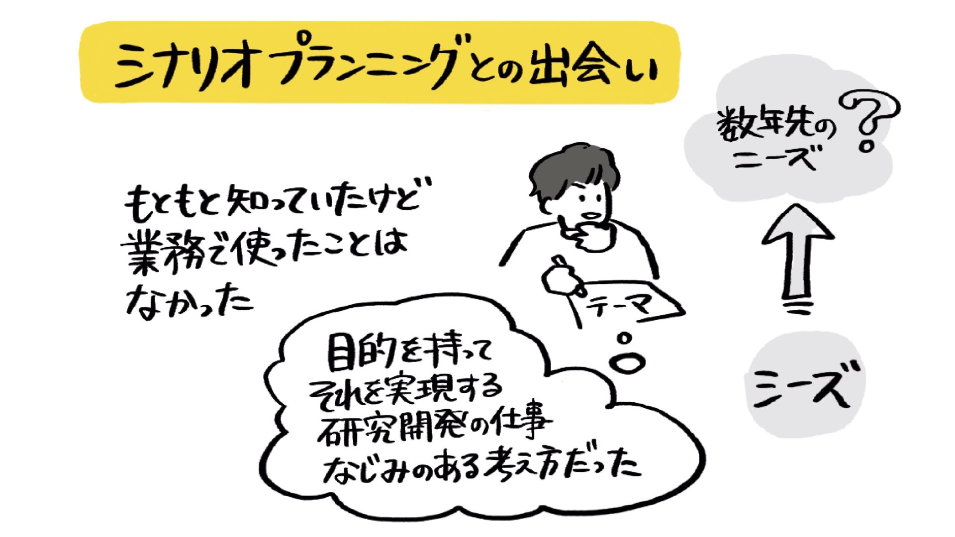 福島さん:はい、導入前に技術顧問からシナリオプランニングのことは聞いたことがあり、本を読んである程度は理解していました。ただ、実際の業務に取り入れるまではできていませんでしたね。私たち開発担当は、「目の前のことだけでなく数年先の未来を見越し、まだ顕在化していないシーズを狙っていくこと」が大切です。そうした考え方に近い部分があったため、会社規模でシナリオプランニングを活用できる機会に対しては、ワクワクする気持ちが大きかったですね。