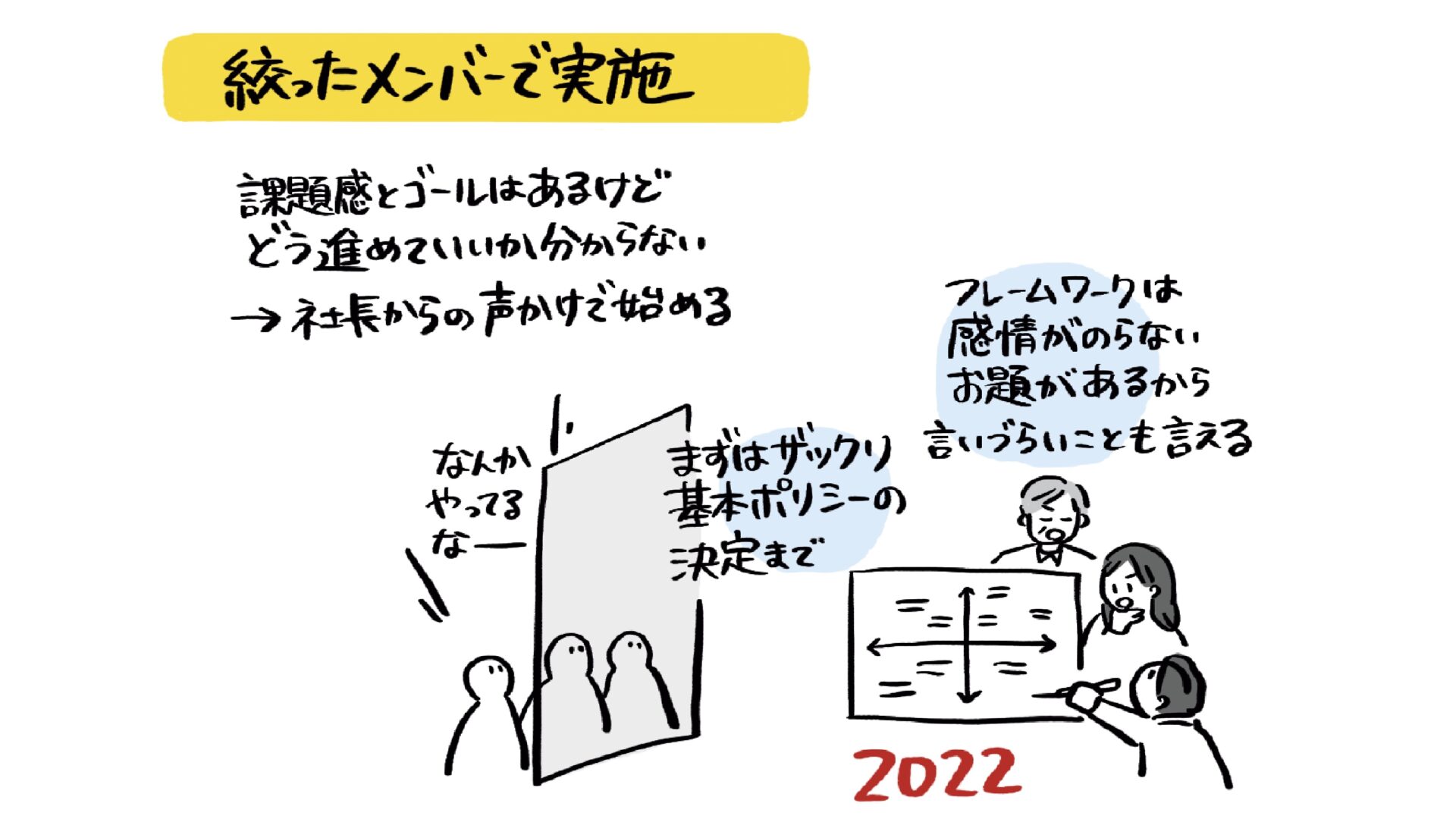 福島さん:ヒロさん(当社新井)が関わってくださる前に、管理職の3名で中期経営計画を作っていたんです。それを、より自分ごと化、会社の目的としていくにはどうすれば良いかを、シナリオプランニングを使いながら考えました。2022年はどちらかというと売上規模の目標や、その実現のために人員がどれくらい必要かといった大枠を決めた感じですね。