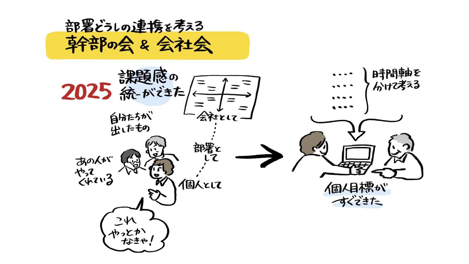 福島さん: 2024年に全社の目指すところ、メーカーとして必要な機能は見えてきたものの、まだ部署間での連携が弱い印象がありました。2025年の取り組みは、シナリオの目標を実現していくために各部署が何をしているかを把握し、行動がどう目標に繋がっているかをお互いに理解した状態にすることが目的でした。ある程度の連携は取れていたんですが、「他の部署はどのような目標を掲げてやっているのか」は見えづらい部分があって。